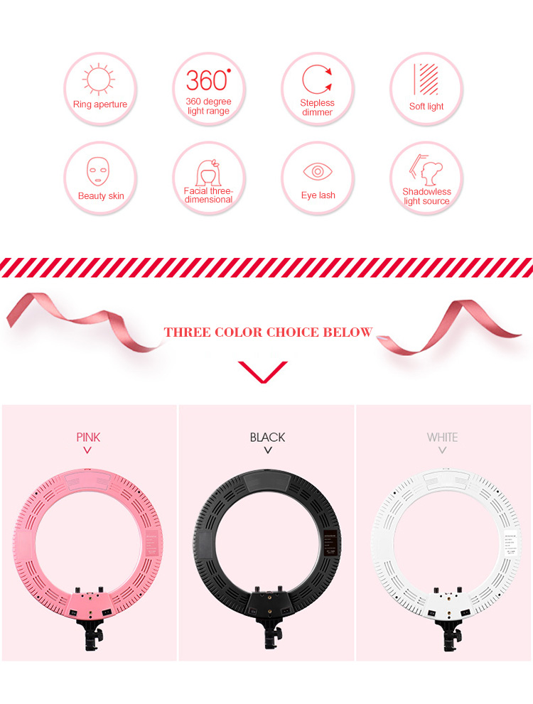 1) Bicolor 3200-5600K Dimmable 18" SMD LED Ring Light with stepless dimming range from 10%-100% and 3200-5600K.